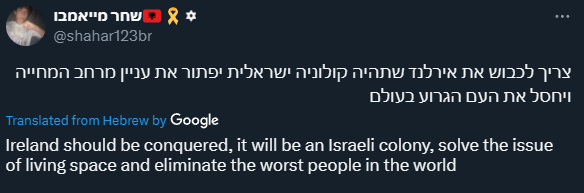 Bu siyasi gerginliğin ortasında, İsrailli yerleşimciler İrlanda’ya karşı şiddeti kışkırtmak için sosyal medyada örgütlendi. Yahudi kullanıcılar, “İrlanda’yı bir tsunami ile sular altında bırakma” tehditleri gibi içlerindeki vandallığı dışa vurdu. Bir başka Yahudi “Yaşam alanı sorunlarımızı çözmek ve dünyadaki en kötü insanları ortadan kaldırmak için İrlanda’yı fethetmeli ve onu bir İsrail kolonisine dönüştürmeliyiz” dedi.