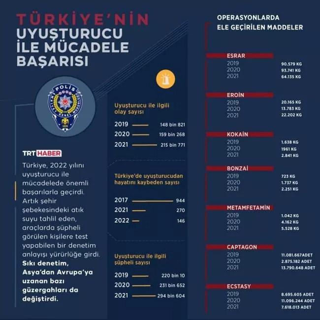 Bu sayı azaldı, 2022’de 178’le kapandı. Uyuşturucu madde bağlantılı ölümler, 2017’de 941’di. 2022 yılı kasım ayı verilerine göre 146’dır. Sayılar siyaset yapmaz, yalan da söylemez.