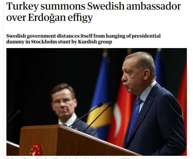 İngiliz Guardian gazetesi “Türkiye, Erdoğan büstü için İsveç büyükelçisini çağırdı” başlığıyla duyurduğu haberde İsveç ve Türkiye’den gelen açıklamalara yer verdi. İsveç’teki görüntünün iki ülke arasındaki gerilimi alevlendirdiği belirtilirken, İsveç’ten gelen açıklamaların Türkiye için “yatıştırıcı” olmadığı ifade edildi.