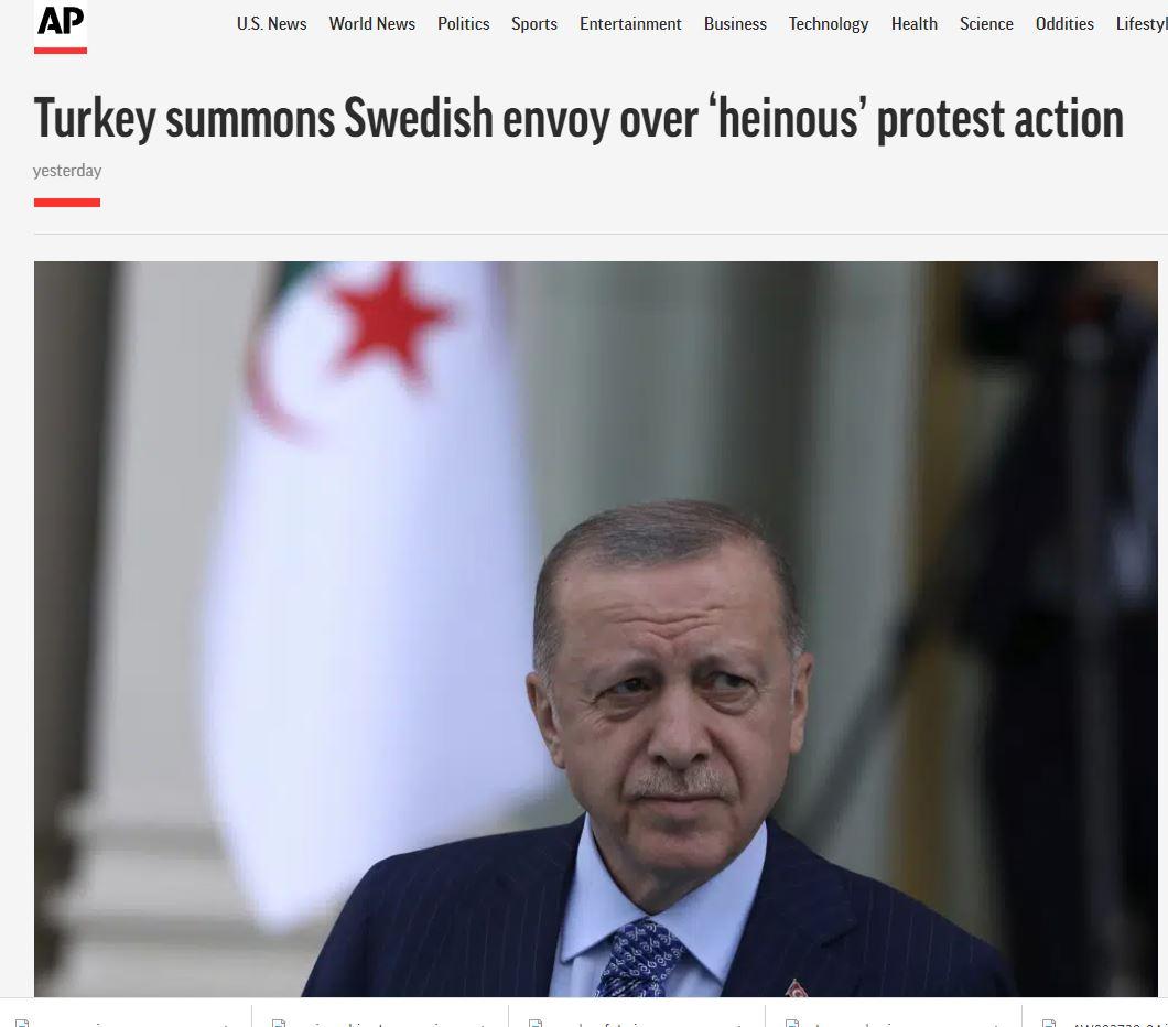 Amerikan haber ajansı Associated Press ajansı ise haberi “Türkiye, İsveç büyükelçisini ‘iğrenç’ protesto eylemi nedeniyle çağırdı” başlığını kullandı. Haberde iki ülkeden de gelen açıklamalara yer verilirken Kasım ayında, Stockholm’deki Türkiye Büyükelçiliği binasına Erdoğan’a yönelik skandal ifadelerin yer aldığı görüntülerin yansıtılması olayı da hatırlatıldı.
