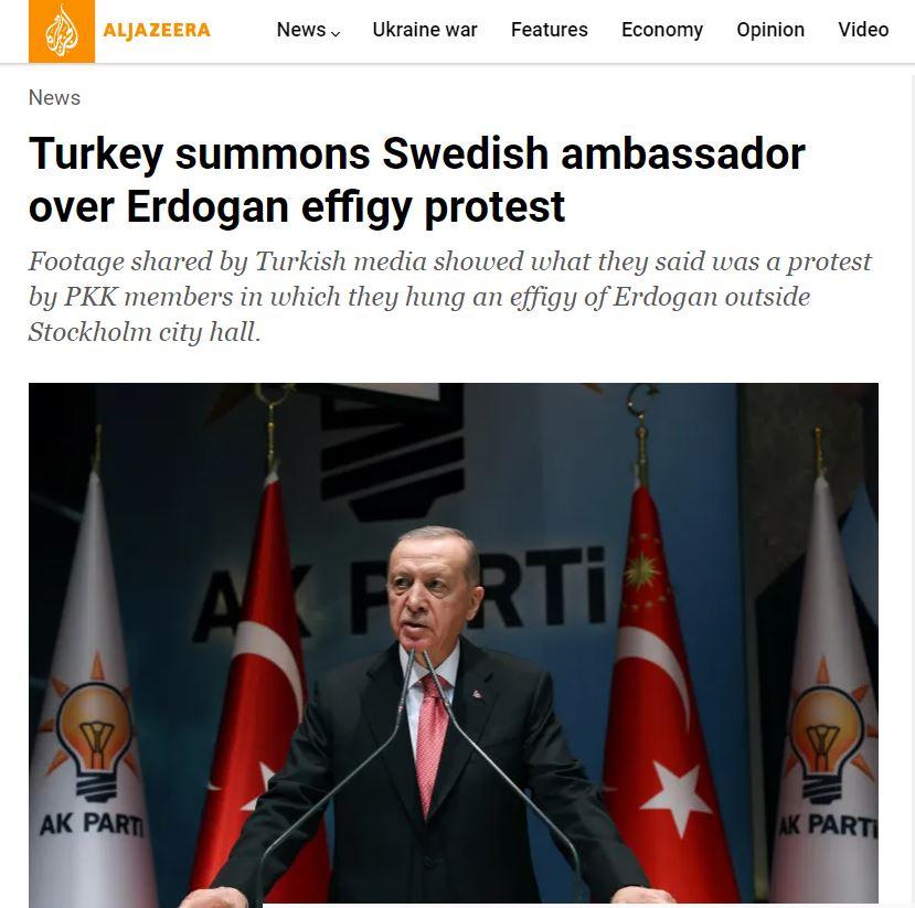 Al Jazeera ise haberi “Türkiye, Erdoğan heykeli protestosu için İsveç büyükelçisini çağırdı” başlığı ile duyurdu. Haberde İsveç Dışişleri Bakanı Tobias Billstrom’un Stockholm’ün olayı kınadığını ancak herhangi bir ülkeye doğrudan atıfta bulunmadığını söylediği ifadelerine yer verildi.