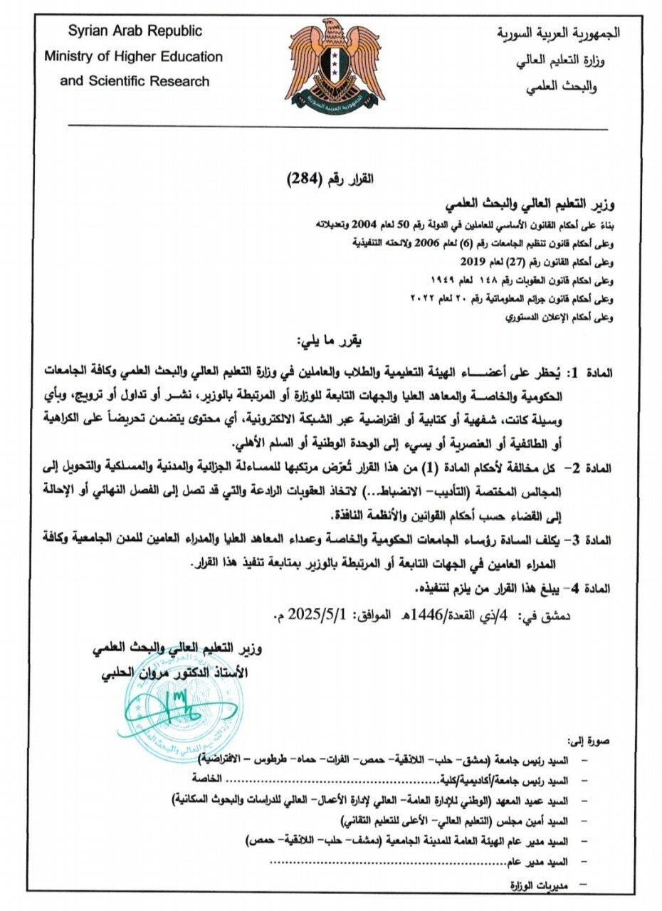 Suriye Yükseköğretim Bakanlığı, üniversitelerde ağızlara kilit vuracak bir kararname yayımladı. Mezhepçilik, ırkçılık ve nefret söylemiyle mücadele amacı taşıdığı belirtilen kararda, öğrenciler ve öğretim üyeleri bundan böyle “birtakım” içerikleri yazamaz, paylaşamaz, hatta ima bile edemez. Aksi takdirde, kapı dışarı edilmekten yargılanmaya kadar uzanan ağır yaptırımlar gündeme gelecek.