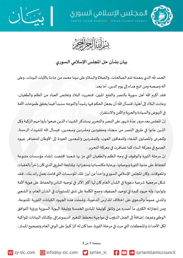 Suriye’de devrim sürecinin en etkili dini yapılarından biri olan Suriye İslami Meclisi, kendisiyle birlikte tüm bağlı kuruluşlarının resmen feshedildiğini duyurdu. Kararın, geçici hükümetin talebi doğrultusunda alındığı açıklandı.