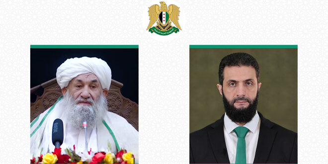 Suriye Arap Cumhuriyeti Cumhurbaşkanı Ahmed El Şara, Afganistan Emirliği Başbakanı Muhammed Hasan Akhund’dan, Suriye Arap Cumhuriyeti Cumhurbaşkanı olarak göreve başlamasından dolayı bir tebrik mesajı aldı.