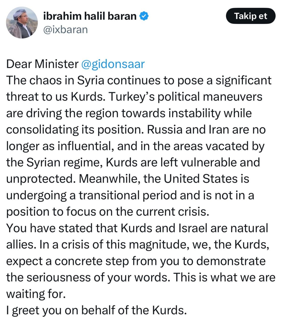 Kürt yanlısı konuşmaları ile bilinen ve aynı zamanda Kürdistani Parti’nin kurucusu olan İbrahim Halil Baran adlı şahıs, sosyal medya hesabı üzerinden İsrail’in Siyonist bakanına “bakanımız” diyerek hitap etti.