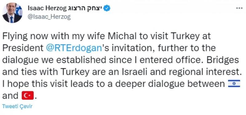 Türkiye’ye hareketi öncesi sosyal medya hesabından da ziyareti hakkında değerlendirmelerde bulunan Herzog, “Cumhurbaşkanı Recep Tayyip Erdoğan’ın daveti üzerine şimdi eşim Michal ile Türkiye’yi ziyaret etmek üzere uçuyoruz, göreve başladığımdan beri kurduğumuz diyaloğun devamı. Türkiye ile köprüler ve bağlar İsrail ve bölgesel bir çıkardır. Umarım bu ziyaret Türkiye ve İsrail arasında daha derin bir diyaloga yol açar.” ifadelerine yer verdi.