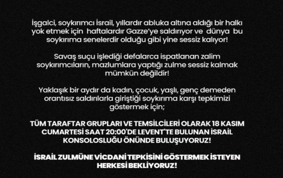 Üç büyük taraftar grubu Siyonist İsrail’in Filistin’de yaptığı soykırım için İstanbul Levent’te bulunan İsrail konsolosluğu önünde toplanacak.