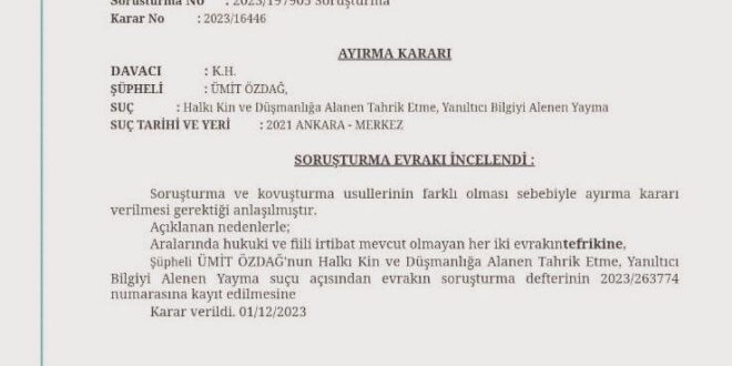 Ankara Cumhuriyet Başsavcılığı, Zafer Partisi Genel Başkanı Ümit Özdağ hakkında “Halkı kin ve düşmanlığa tahrik etme” suçundan soruşturma başlattı.