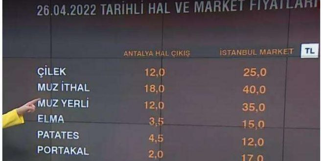 26 Nisan 2022 tarihli hal ve market fiyatı çileğin Antalya’dan çıkış fiyatı 12 lira İstanbul’daki markette satışı 25 lira. İthal muz Antalya halden çıkışı 18 lira İstanbul’da markette 40 lira, patates Antalya çıkışlı 4.5 lira İstanbul markette 12 lira, portakal Antalya hal çıkışında 2 lira İstanbul’da markette 17 liradan satılıyor.”